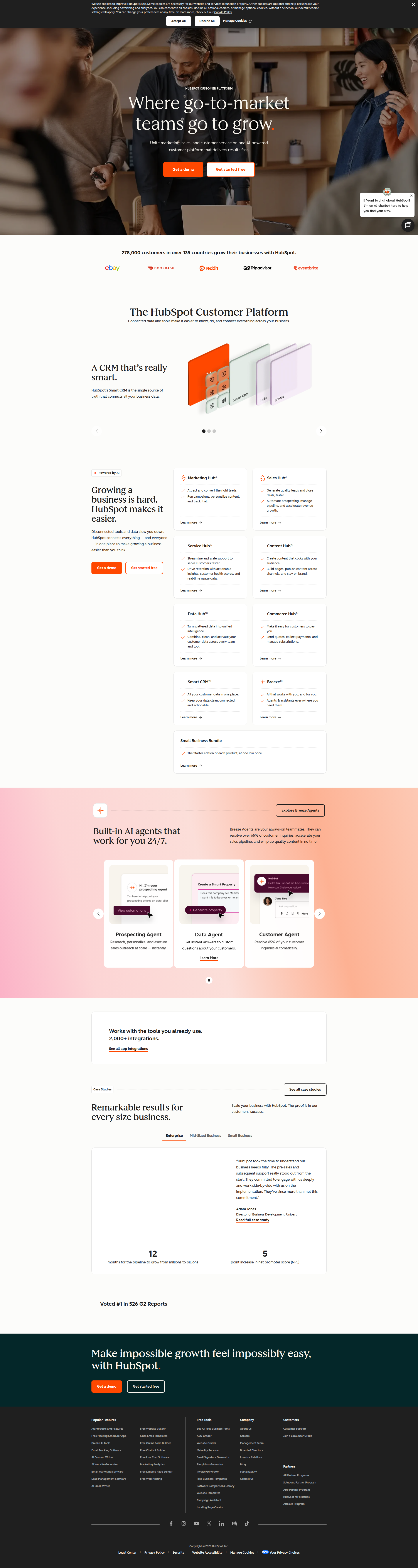 Ton hero, c'est du travail correct mais sans âme. 'Where go-to-market teams go to grow scale close retain grow' - cette animation avec les mots qui changent, c'est joli mais ça dit quoi exactement ? Au moins on comprend que tu t'adresses aux équipes commerciales et marketing, c'est déjà ça. Ton sous-titre 'Unite marketing, sales, and customer service on one AI-powered customer platform' fait le job : je sais ce que tu vends, à qui, et le bénéfice principal. Bravo pour ça ! Tes deux CTA sont bien placés et visibles - 'Get a demo' pour les entreprises, 'Get started free' pour les petites boîtes. Malin. Ta preuve sociale '278,000 customers in over 135 countries' claque direct, c'est du lourd ! Le visuel de ta plateforme montre concrètement le produit, pas une photo de startup hipster qui boit un café. AVANT : 'Where go-to-market teams go to grow scale close retain grow' APRÈS : 'La plateforme CRM qui fait grandir 278,000+ entreprises' Mais putain, pourquoi tu compliques tout ? Cette animation de mots qui tournent, ça fait gadget PowerPoint 2010. Et ton message principal prend 8 secondes à comprendre au lieu de 3. Tu perds des visiteurs sur cette hésitation. Simplifie, humanise, et arrête de parler comme un robot !