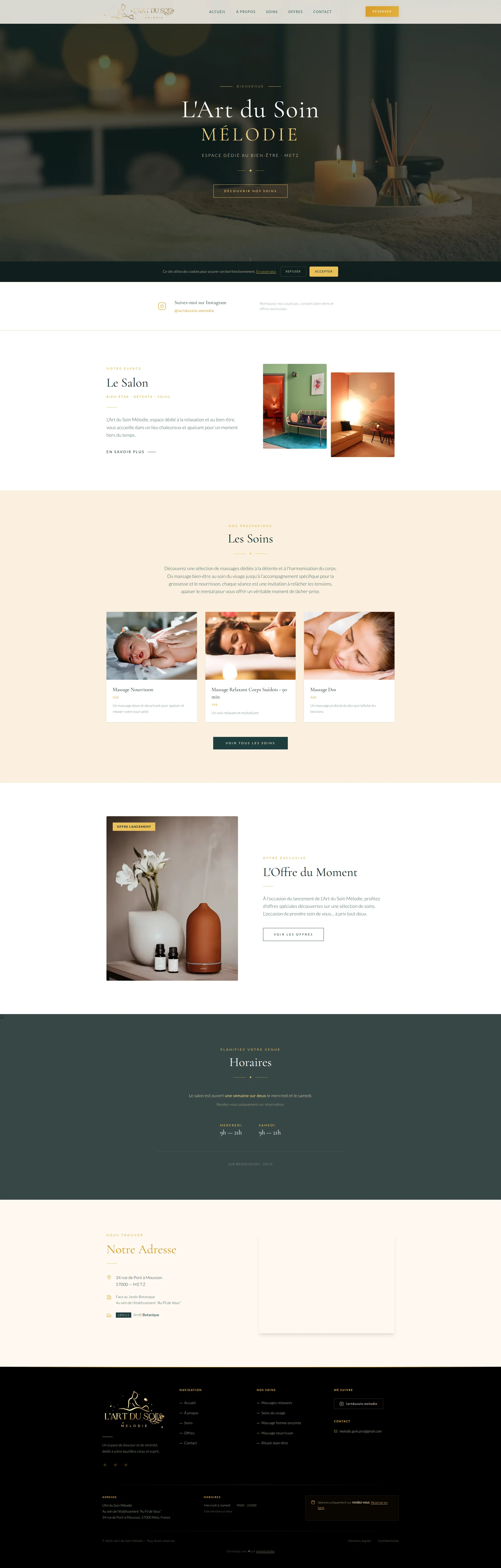 Le hero de L'Art du Soin Mélodie, c'est une belle vitrine de fleuriste : on s'arrête, on admire, et on continue son chemin. Visuellement, la photo d'ambiance avec les bougies et les diffuseurs fonctionne — les tons chauds, la lumière tamisée, ça parle immédiatement à une clientèle bien-être. La hiérarchie typographique entre 'L'Art du Soin' et MÉLODIE en grand est claire. La localisation METZ est visible. Jusque-là, c'est correct.