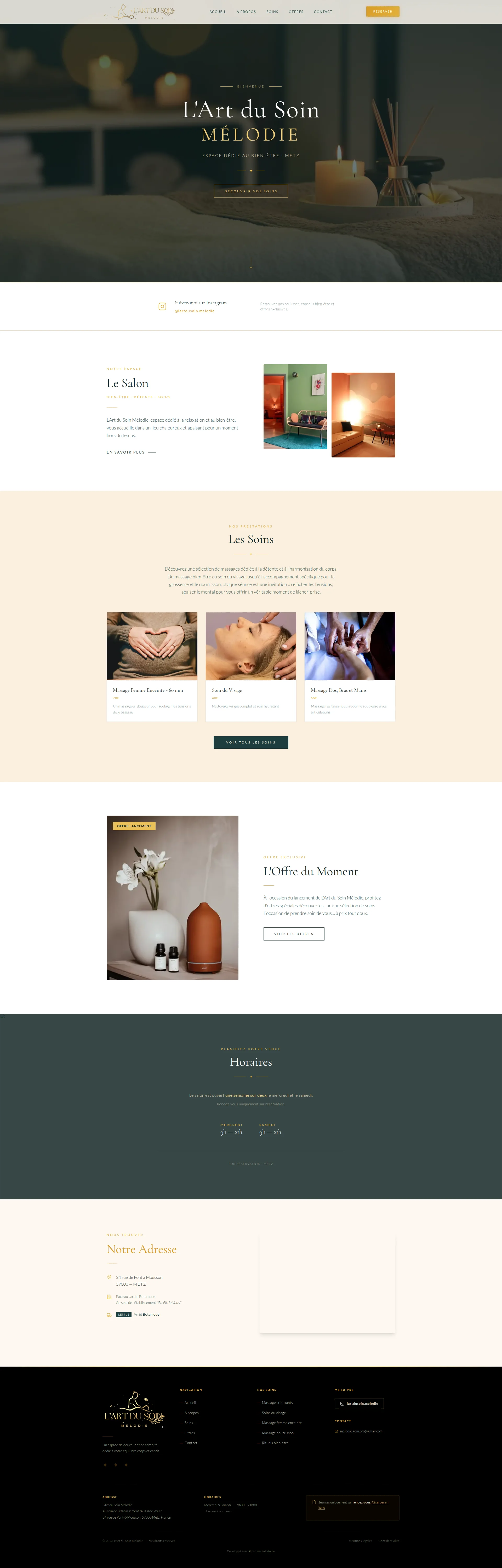 Le hero de L'Art du Soin Mélodie, c'est une belle carte postale. La photo d'ambiance avec les bougies et les diffuseurs d'huiles essentielles, le titre 'L'Art du Soin MÉLODIE' en typographie élégante, le sous-titre ESPACE DÉDIÉ AU BIEN-ÊTRE · METZ — visuellement, c'est propre, c'est cohérent avec l'univers bien-être premium. Le CTA DÉCOUVRIR NOS SOINS est visible au-dessus de la fold. Jusque-là, pas de honte.