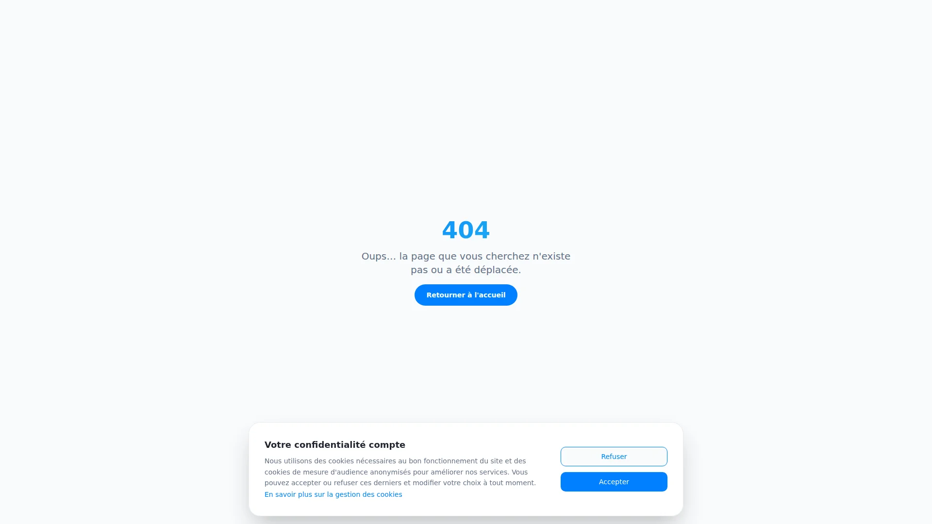Ta page 404, c'est le miroir de ton approche ! Ton titre '404' est clair - pas de mystère, on comprend direct qu'on s'est planté. Le message 'Oups... la page que vous cherchez n'existe pas ou a été déplacée' fait le boulot sans chichi. Ton CTA 'Retourner à l'accueil' en bleu vif, bien contrasté sur le fond blanc - techniquement, c'est parfait. L'utilisateur sait exactement quoi faire. MAIS bordel, quelle occasion ratée ! Une page 404, c'est l'opportunité PARFAITE de montrer ta personnalité ! Tu aurais pu écrire 'Cette page a bugué comme un code mal testé' ou 'Erreur 404 : cette page s'est volatilisée plus vite qu'un budget IT mal géré'. Au lieu de ça, tu restes dans le générique total ! Pas de proposition alternative ('Peut-être cherchiez-vous nos services SaaS ?'), pas de touch d'humour, rien qui me donne envie de rester sur ton site. Tu transformes une erreur en opportunité manquée !