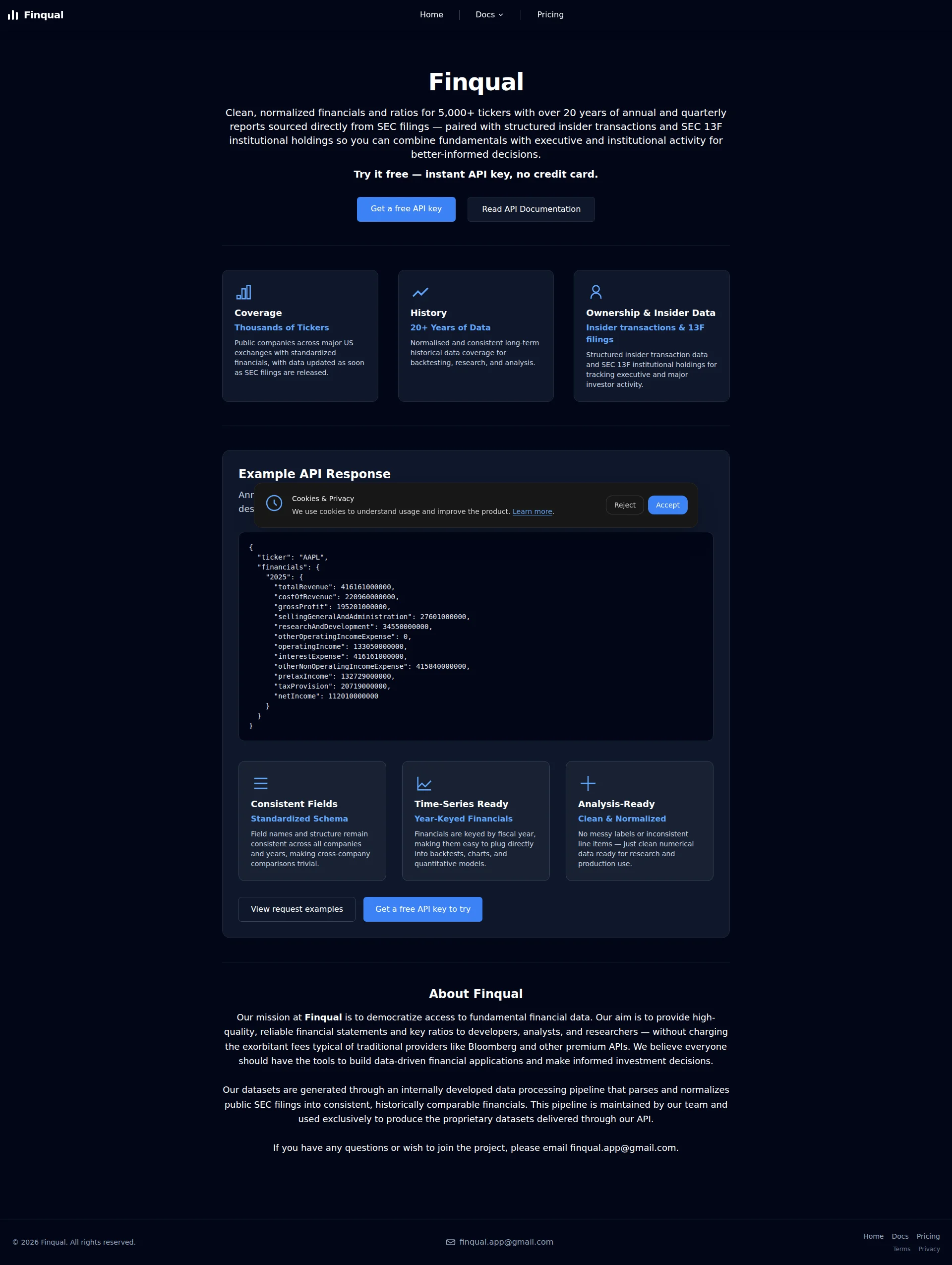 Our mission at Finqual is to democratize access to fundamental financial data. Our aim is to provide high-quality, reliable financial statements and key ratios to developers, analysts, and researchers — without charging the exorbitant fees typical of traditional providers like Bloomberg and other premium APIs.