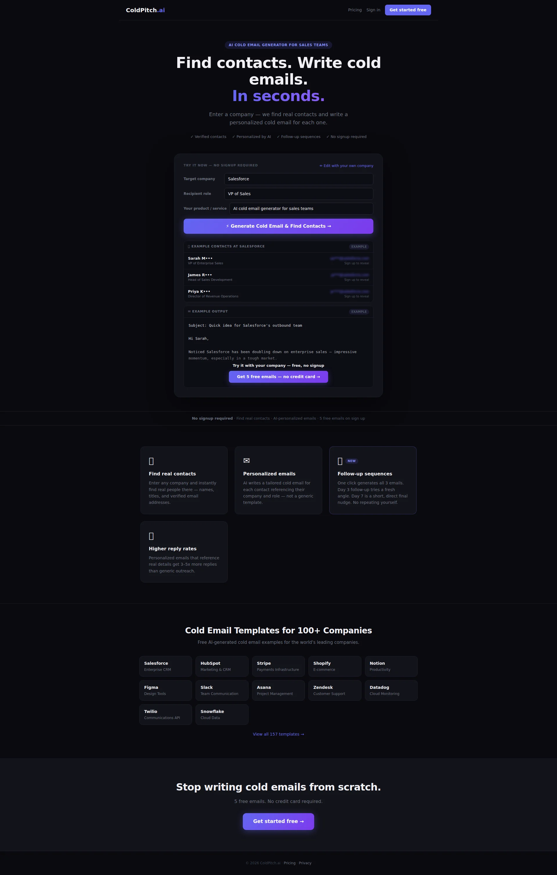 RIGHT, let's talk about this hero section. The headline — Find contacts. Write cold emails. In seconds. — is CLEAN. Punchy. Lands in under two seconds. The visitor knows EXACTLY what you do and why they should care. That purple accent on In seconds. is a nice touch — draws the eye straight to your speed differentiator like a perfectly placed garnish. The subhead Enter a company — we find real contacts and write a personalized cold email for each one is clear, concrete, no MBA waffle. I actually LIKE this. There, I said it.