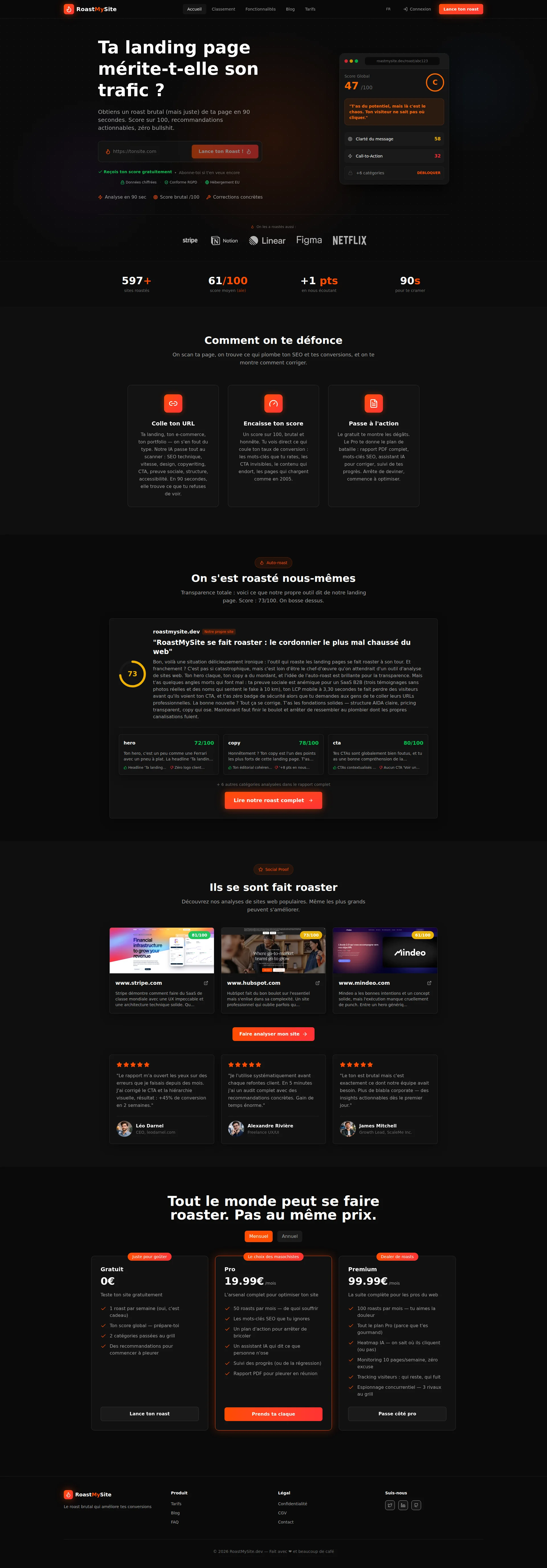 Le sous-titre Obtiens un roast brutal (mais juste) de ta page en 90 secondes. Score sur 100, recommandations actionnables, zéro bullshit. — tu réponds au quoi, au combien de temps, et au pourquoi toi plutôt qu'un autre. C'est la trilogie parfaite. Le CTA Lance ton Roast ! en bouton orangé sur fond sombre, il pète aux yeux, impossible de le louper above the fold. Et ton micro-copy Reçois ton score gratuitement qui gère l'objection prix avant même qu'elle existe ? Intelligent. Bien joué.
