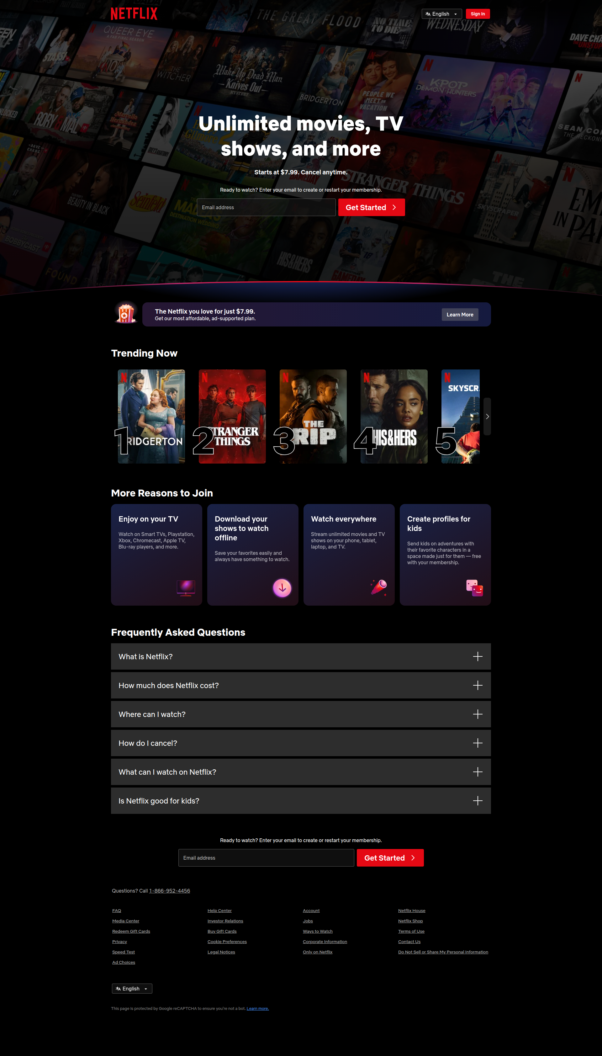 Ton hero me donne envie de dormir plus qu'un épisode de documentaire animalier. 'Unlimited movies, TV shows, and more' - félicitations, tu viens de décrire TOUS tes concurrents en une phrase ! Disney+, Prime Video, Apple TV+, tous peuvent dire exactement la même chose. Où est ta différenciation ? Ton hook émotionnel ? Ta valeur unique ? Ton CTA 'Get Started' est visible, je te l'accorde, mais c'est le minimum syndical. Au moins il contraste avec le rouge Netflix, ça c'est professionnel. Mais le texte ? Encore du générique ! Et ta preuve sociale dans le hero ? INEXISTANTE. Tu as 230 millions d'abonnés et tu n'en parles nulle part ! C'est comme avoir une Ferrari et rouler en première. Ton trending maintenant avec Bridgerton et Stranger Things, c'est bien, mais c'est en dessous du pli sur mobile. BEFORE: 'Unlimited movies, TV shows, and more' AFTER: 'Rejoins 230M de fans qui regardent Stranger Things, Bridgerton et 15,000+ autres titres' Ton sous-titre 'Starts at $7.99' est pratique mais sans émotion. Parle-moi de valeur, pas de prix ! BEFORE: 'Enter your email to create or restart your membership' AFTER: 'Commence ton addiction en 30 secondes (annulable quand tu veux)'