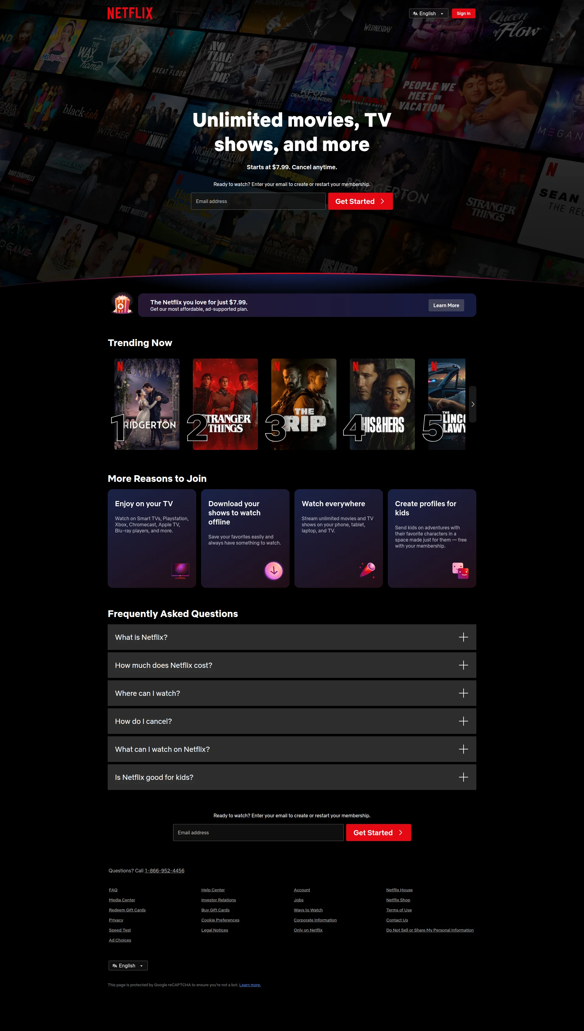 Putain Netflix, ton hero me fait bâiller plus qu'un documentaire sur la fabrication des chaussettes ! 'Unlimited movies, TV shows, and more' - cette phrase, mes concurrents Disney+, Prime Video et Apple TV+ peuvent l'utiliser mot pour mot ! C'est du copier-coller de catalogue générique ! Tu as dans tes tiroirs Stranger Things, Bridgerton, The Crown, des exclusivités que le monde entier s'arrache, et tu choisis de parler comme un distributeur de DVD de supermarché ? C'est du gâchis monumental ! Tes 230 millions d'abonnés - cette preuve sociale en or massif - tu les caches où exactement ? Dans ton coffre-fort ? Montre-moi ces chiffres ! Crie-le sur tous les toits ! Heureusement, ton prix '7.99$' s'affiche clairement, au moins les gens savent ce qu'ils paient. Et ce CTA rouge sur fond noir, impossible de le louper - ça c'est du Netflix authentique ! Mais 'Get Started' ? Vraiment ? Tu pourrais dire 'Commencer à regarder' ou 'Découvrir mes séries' ! Ta section 'Trending Now' en dessous, elle devrait être TON HERO ! Ces classements avec Bridgerton #1, Stranger Things #2, c'est ça qui fait rêver les gens ! Pas une phrase que tous tes concurrents recyclent !